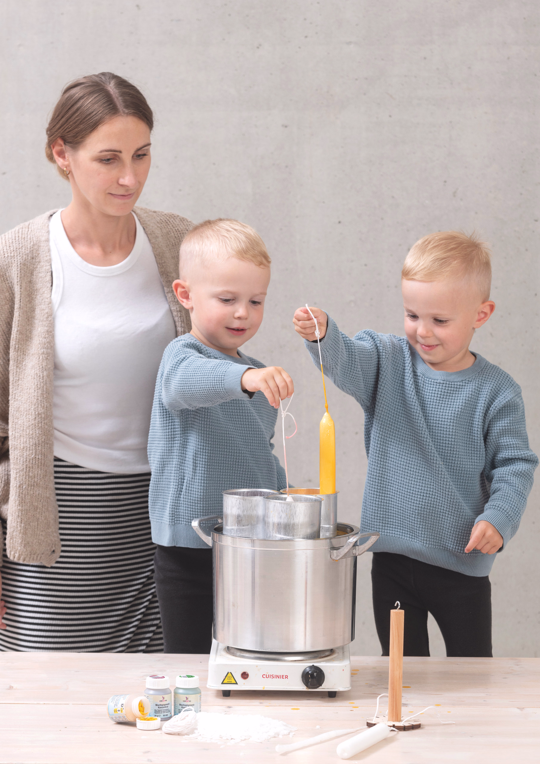 Con questa cera incolore e granulare possono essere prodotte più velocemente rispetto ad una volta delle candele ad immersione. A questo scopo la cera viene fusa e lo stoppino viene immerso più volte nella miscela della cera liquida calda. Ad ogni immersione si pone un nuovo strato di cera attorno allo stoppino in modo che il diametro della candela aumenta in continuo e infine si ottiene una candela mono o multicolore. 2,5 kg, 1 pezzo
