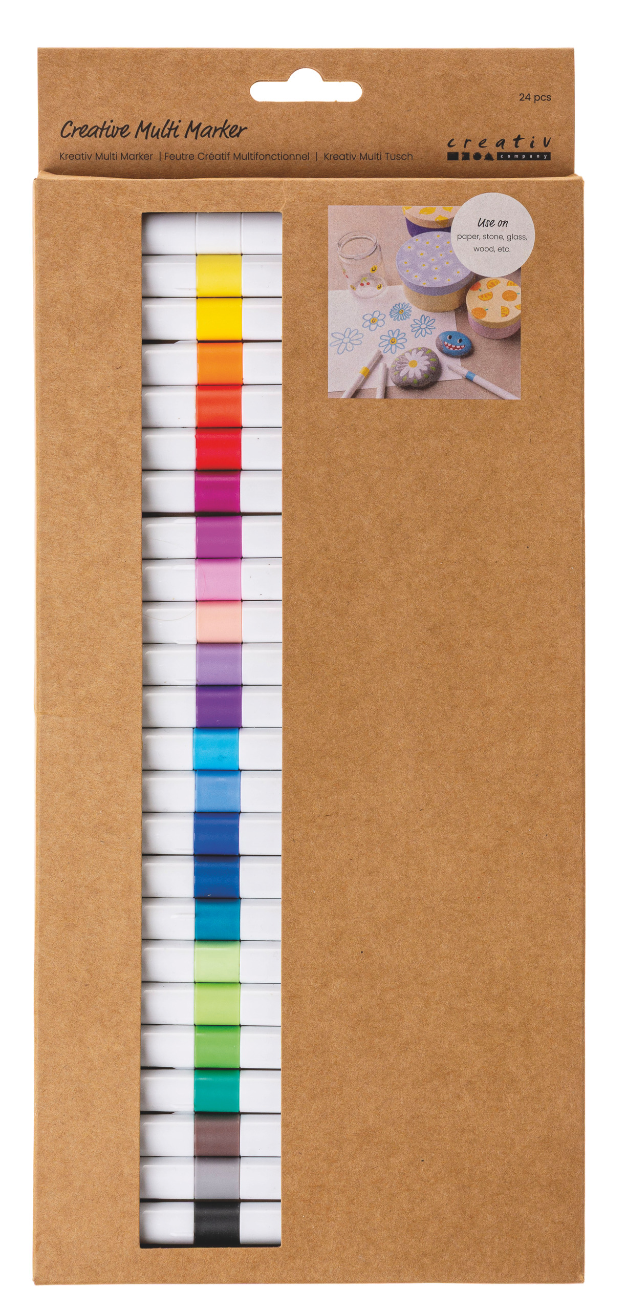 I pennarelli acrilici non permanenti a base d'acqua con colori ricchi sono adatti per carta, tela, legno e pietra. I colori sono impermeabili dopo l'asciugatura, il che è un vantaggio quando si disegna sulla pietra. Possono essere cancellati da porcellana e vetro. Conservare le penne con il coperchio in posizione orizzontale. Se la punta si secca, tamponare sulla carta finché l'inchiostro non fluisce di nuovo, set da 24