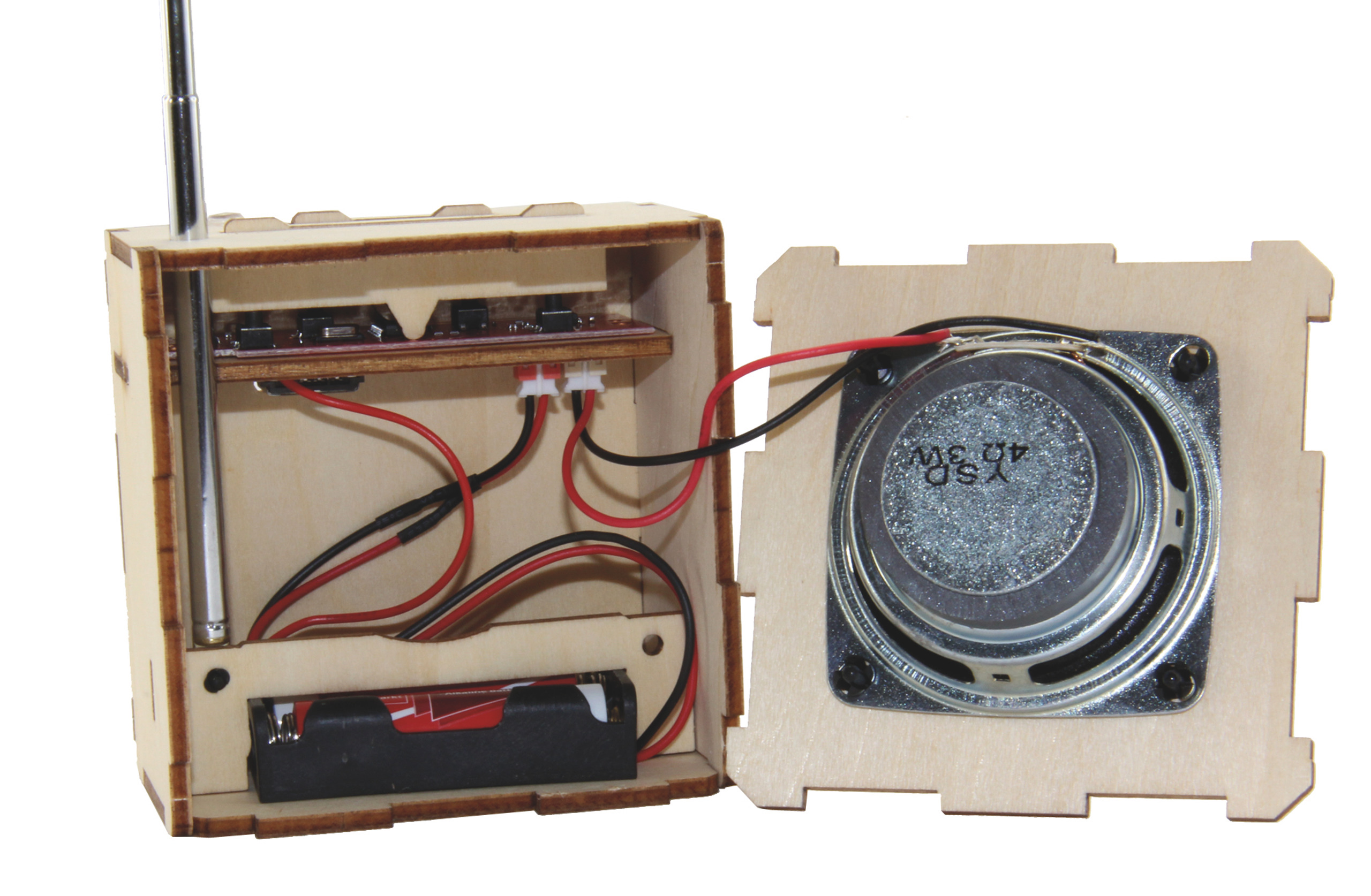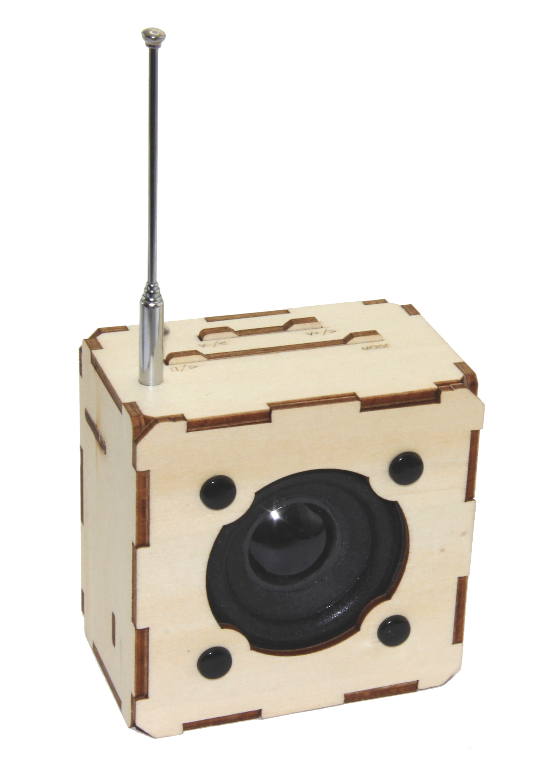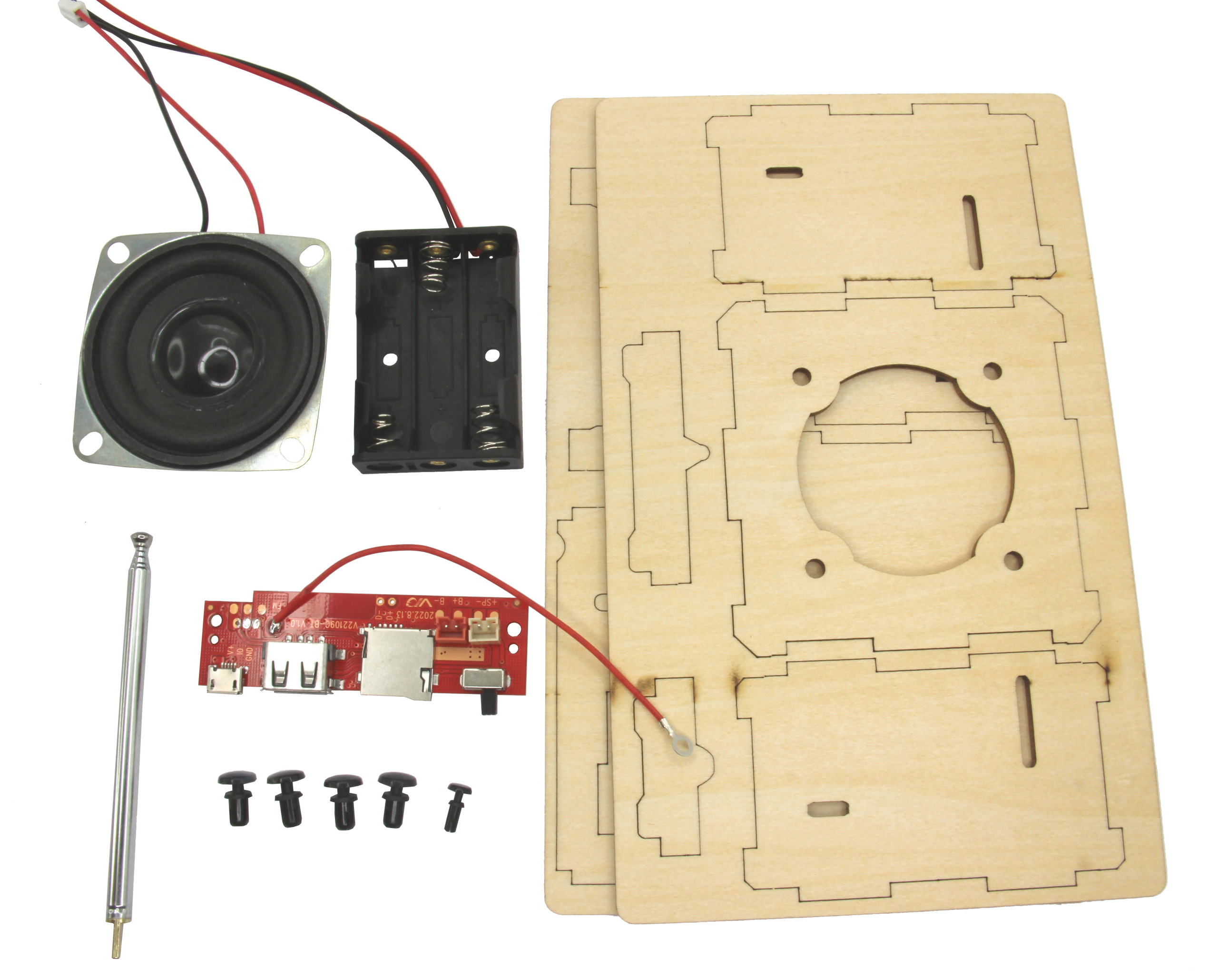De kit bevat een kant-en-klaar gesoldeerde printplaat en 10 nauwkeurig lasergesneden houten onderdelen. De montage duurt ongeveer 60 minuten, zonder solderen of schroeven - ideaal voor beginners, jongeren en ervaren hobbyisten (moeilijkheidsgraad: gemakkelijk-middelmatig).