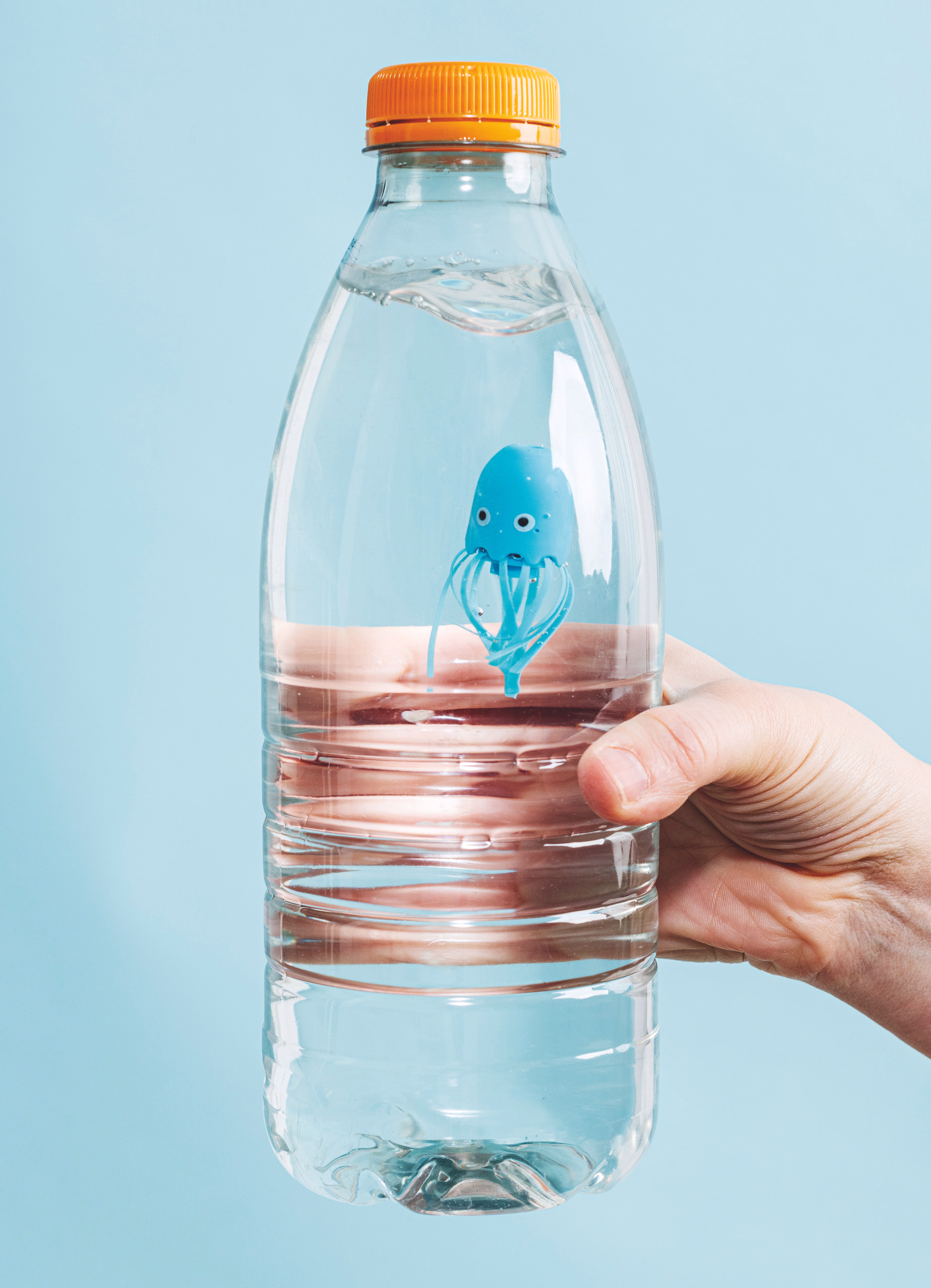 Doe de grappige octopus in een petfles gevuld met water. Sluit goed. Dan kan de show beginnen. Draai de fles ondersteboven, draai hem naar links en rechts, houd hem diag...