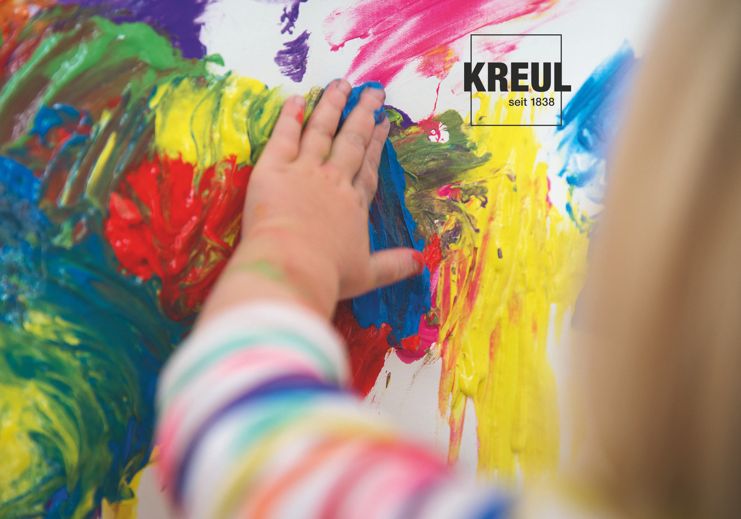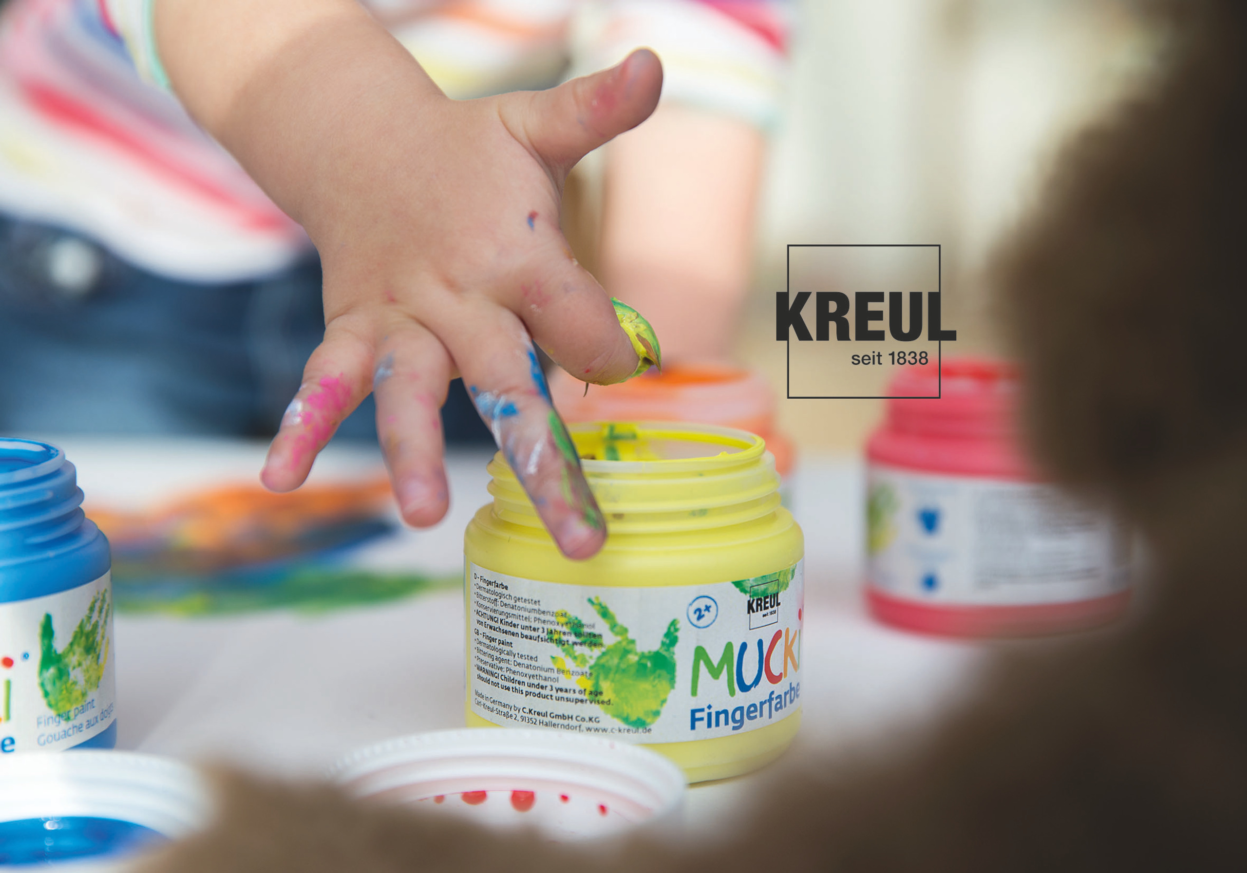 6 kleuren van elk 150 ml in wit, geel, rood, blauw, groen en zwart. Sterke kleur, goed dekkende verf op waterbasis. Crèmige-pasteuze consistentie voor een optimaal gebruik met de vingers en handen maar ook met een penseel, spons of spatel. Bevat bitterstoffen - beschermen tegen onbedoelde consumptie, de verf is dermatologisch getest. Geschikt voor papier, karton, glas, hout, tegels, spiegels en steen. Goed uitwasbaar vanaf 30 °C.