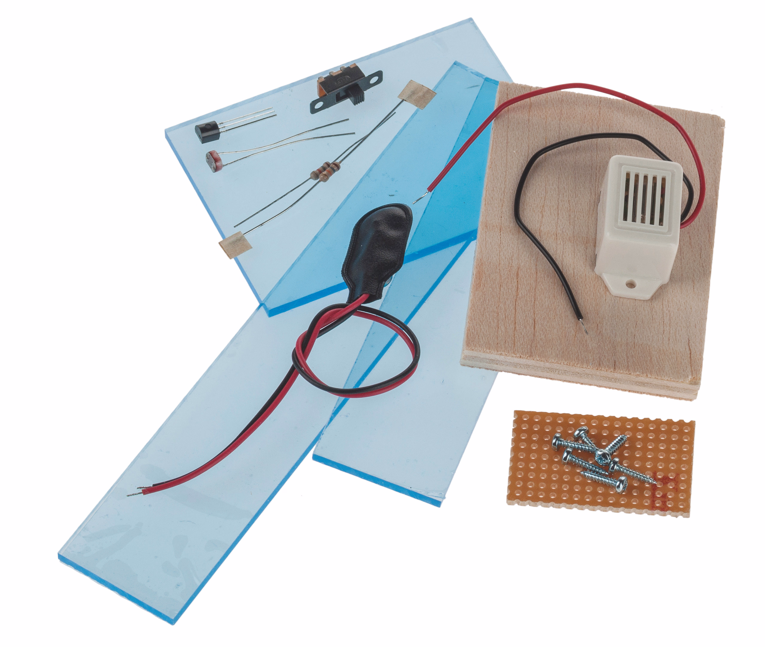 Voorkomende werkzaamheden: aftekenen, boren, zagen, solderen, lijmen en monteren. Excl. 9 V batterij. Afmeting: ca. 80 x 60 x 33 mm, per stuk