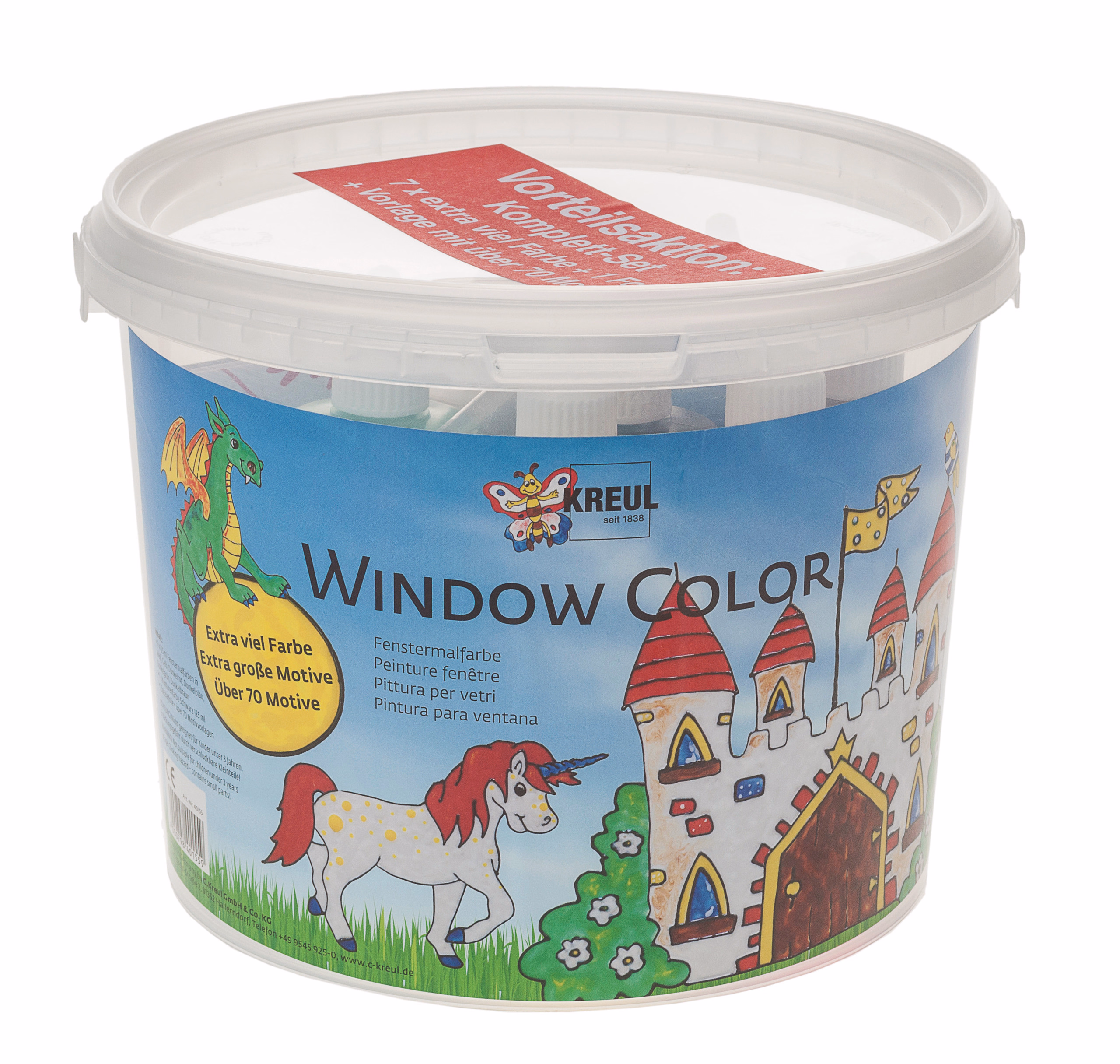 Inhoud: 6x raamverf van elk 125 ml in wit, geel, donkerrood, donkerblauw, donkergroen en donkerbruin, 1x contourverf van 125 ml in zwart, 1x folie en meer dan 70 voorbeelden, per set
