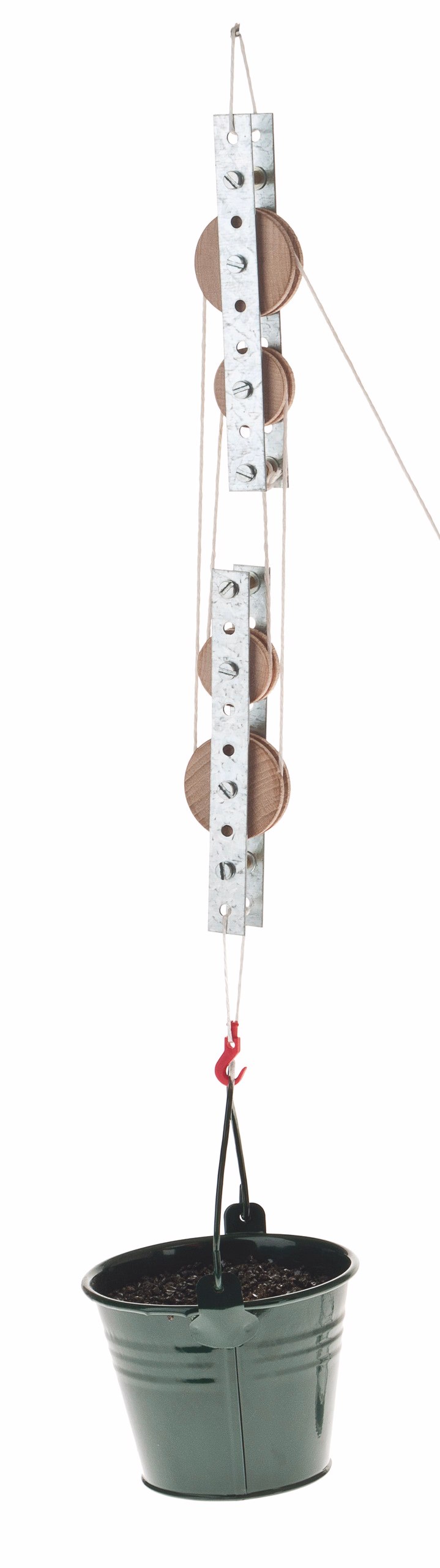 Bouwpakket voor het maken van een katrol bestaande uit 4 kabelrollen. Bouw in klassenverband is mogelijk. Men heeft alleen een schroefsleutel M4, een schroevendraaier en een schaar nodig.