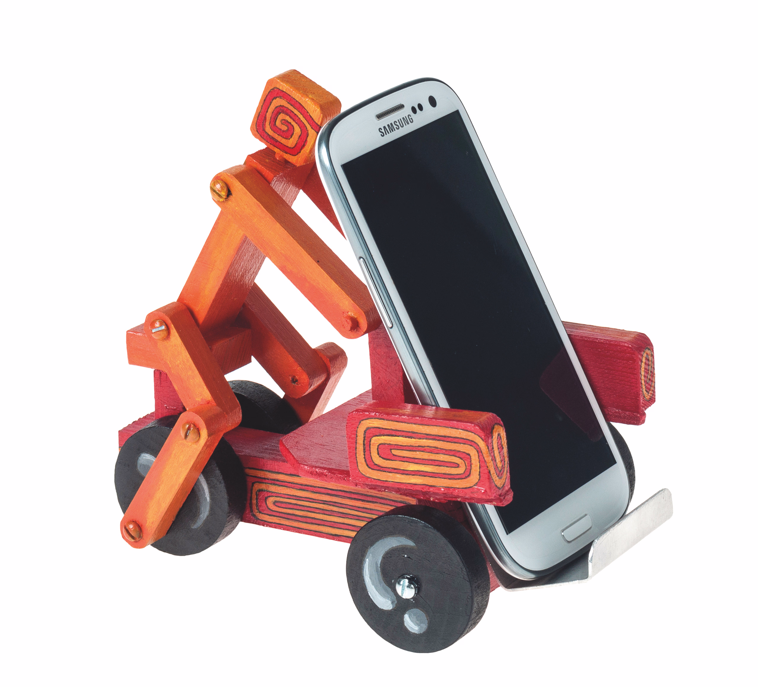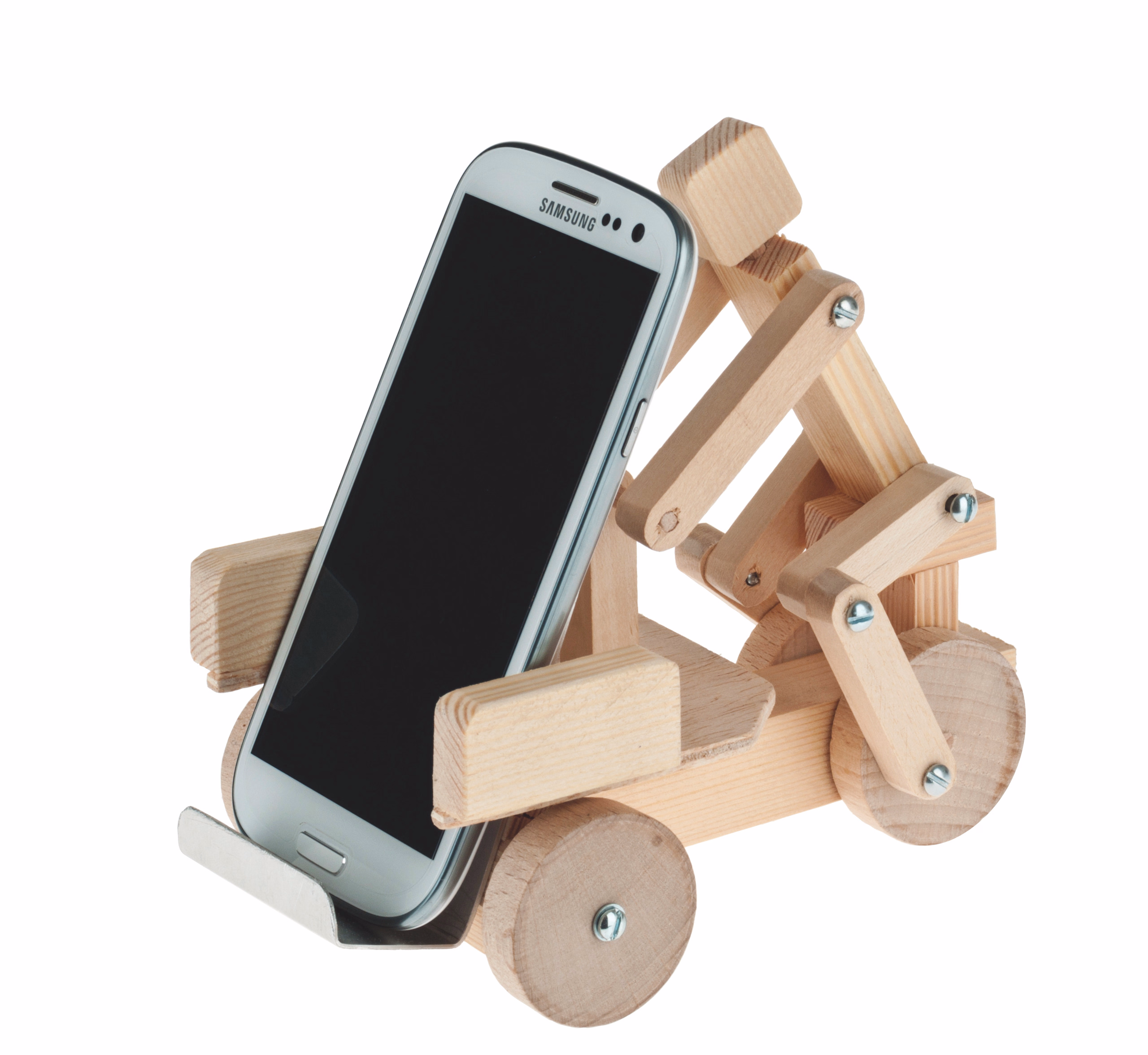 Aantrekkelijk houten bouwpakket met aluminium strook om de mobiel op te zetten.