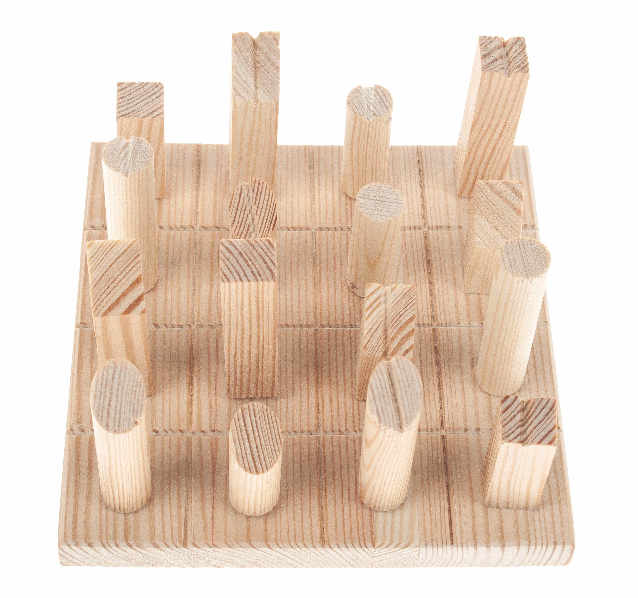 Het massief houten bordspel van grenen en rond hout is geschikt als zaag- een booroefening. De vorm van de stukken maakt een voelbare waarneming (aanraakperceptie) mogelijk, zodat het spel ook blind gespeeld kan worden.