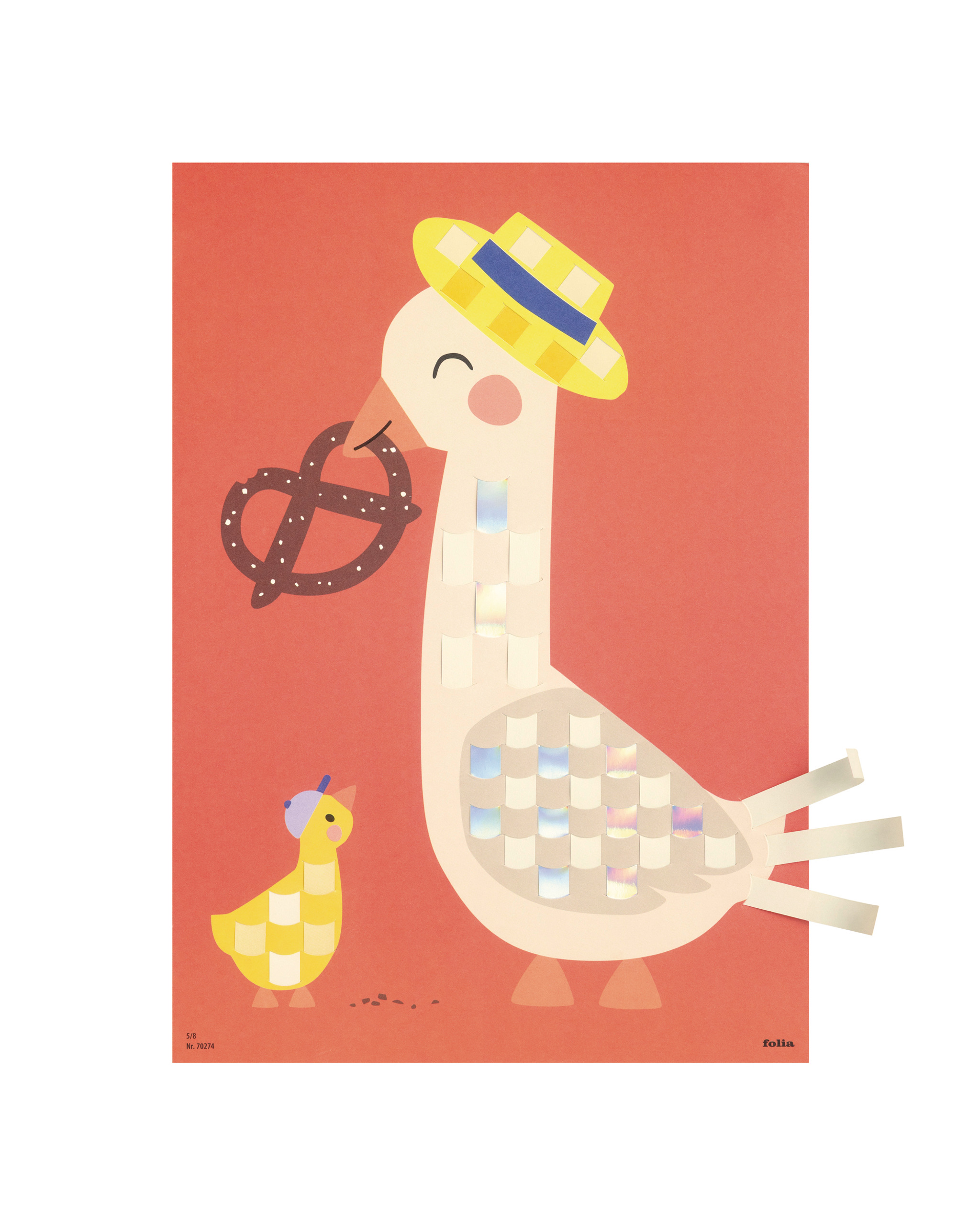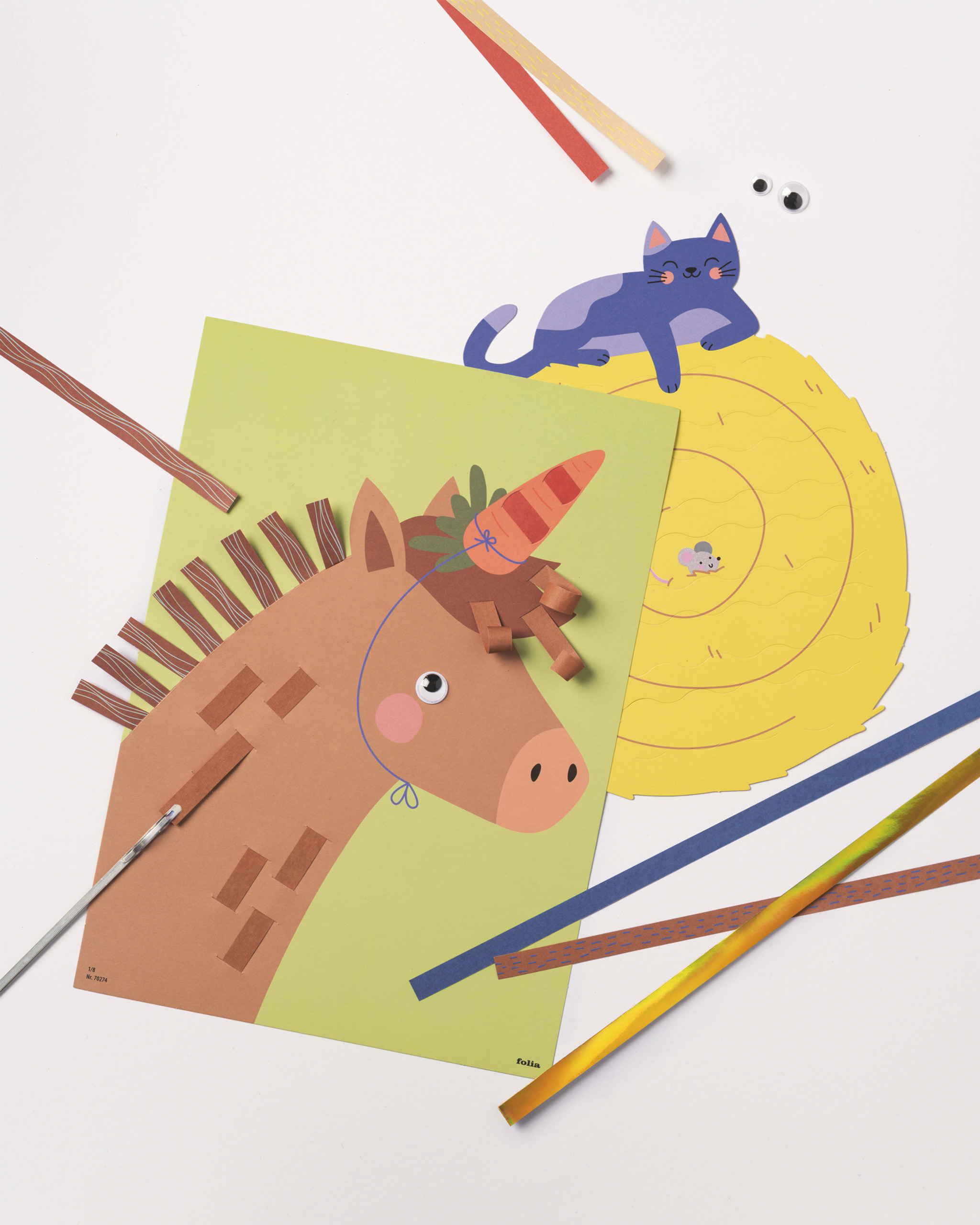 Inhoud: 8 vlechtpatronen (DIN A4, elk 2x), 200 gekleurde vlechtstroken (assortiment), 1 vlechtnaald, 16 wiebeloogjes, 233 stuks